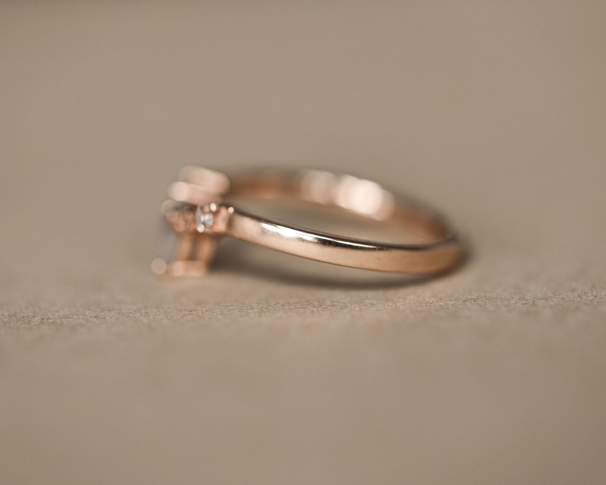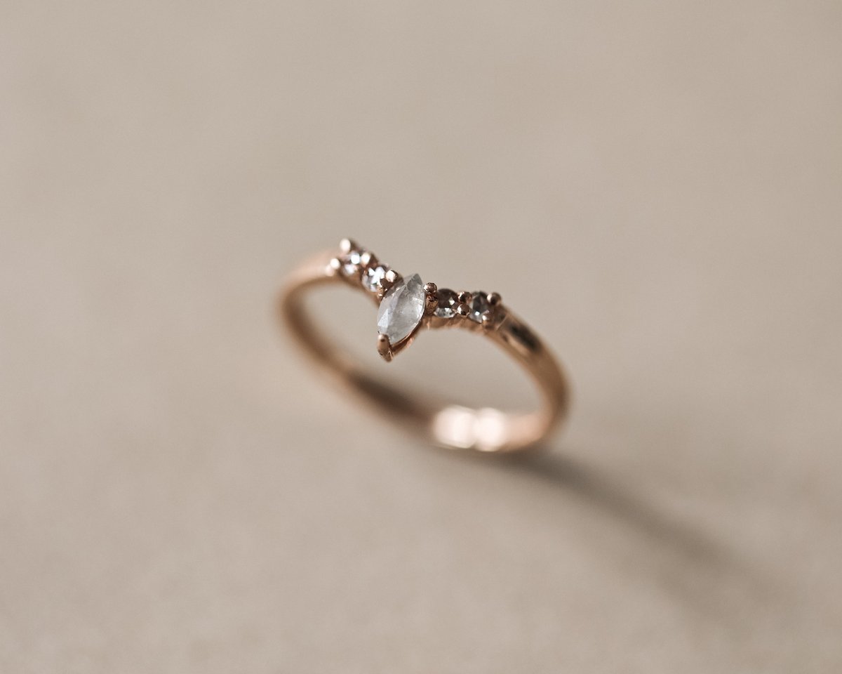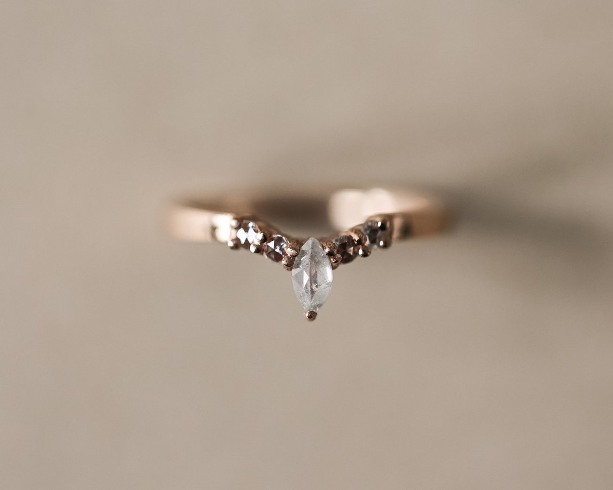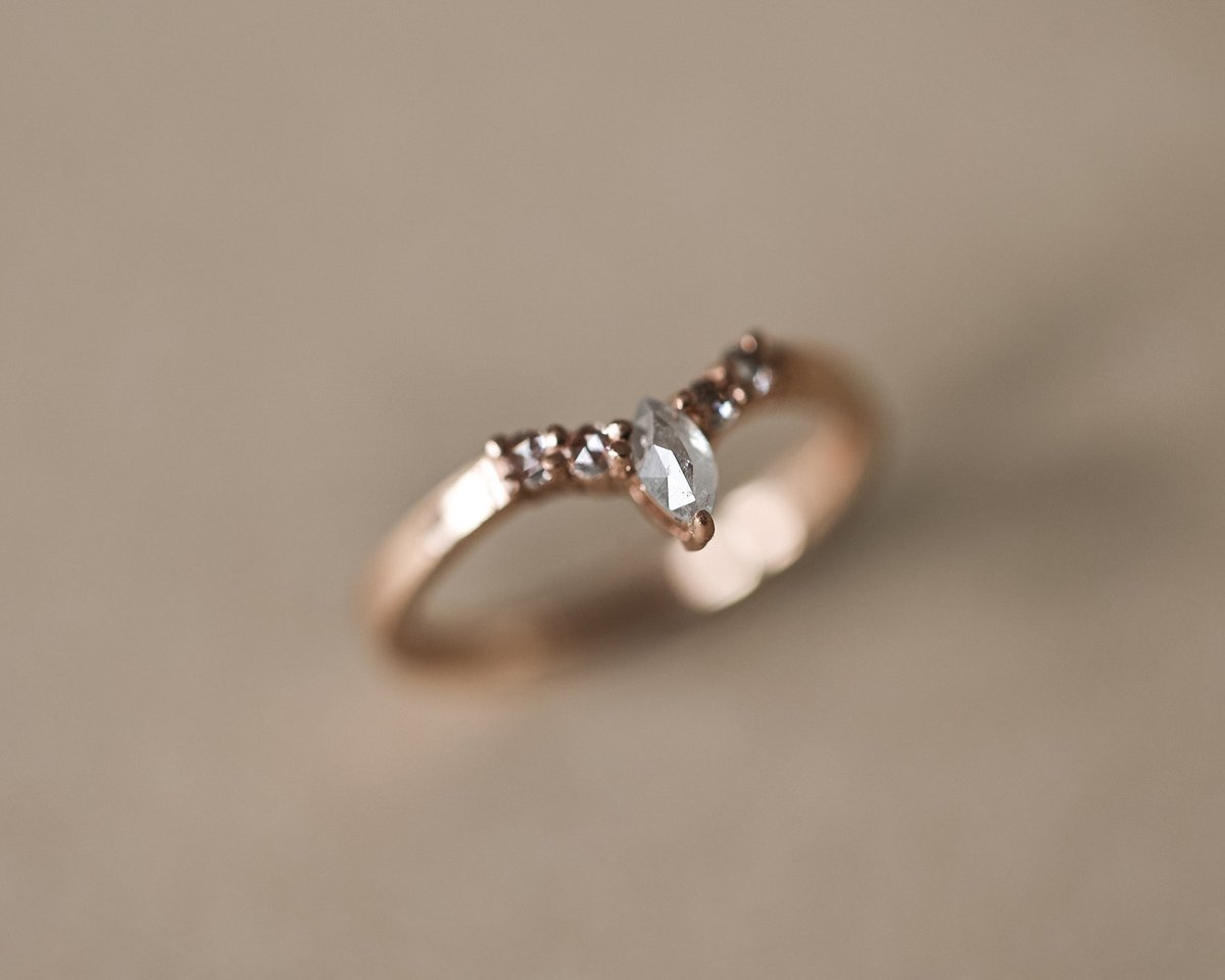 5.0mm x 2.4mm natural milky grey diamond (0.16ct) and four 2.0mm Rose-cut white diamonds with a plain 18ct rose gold band.