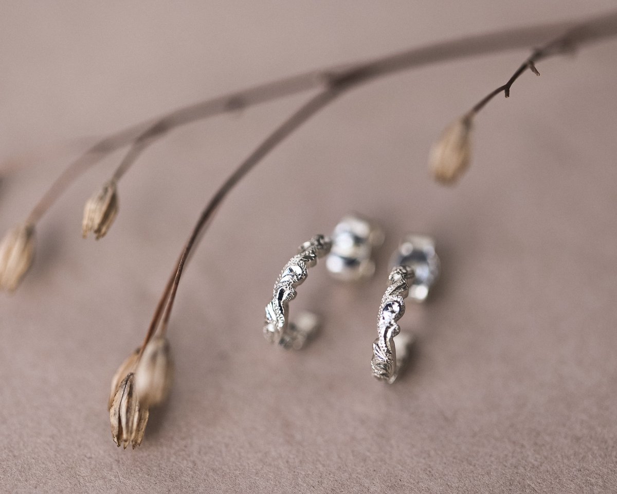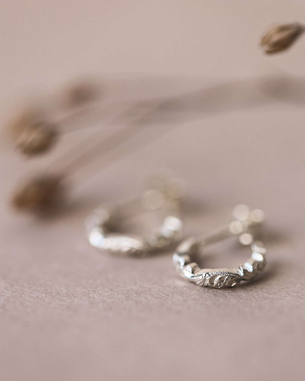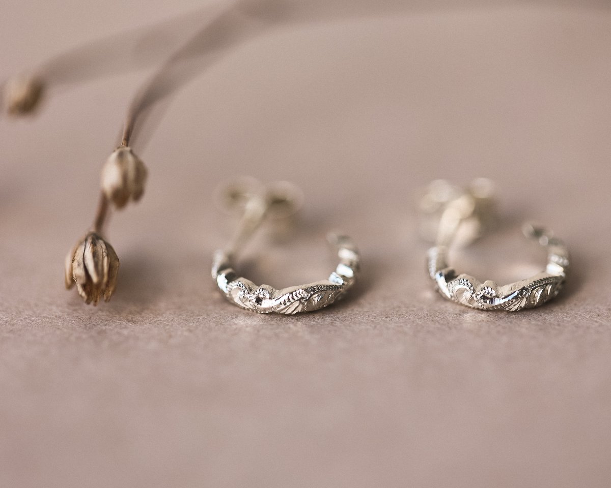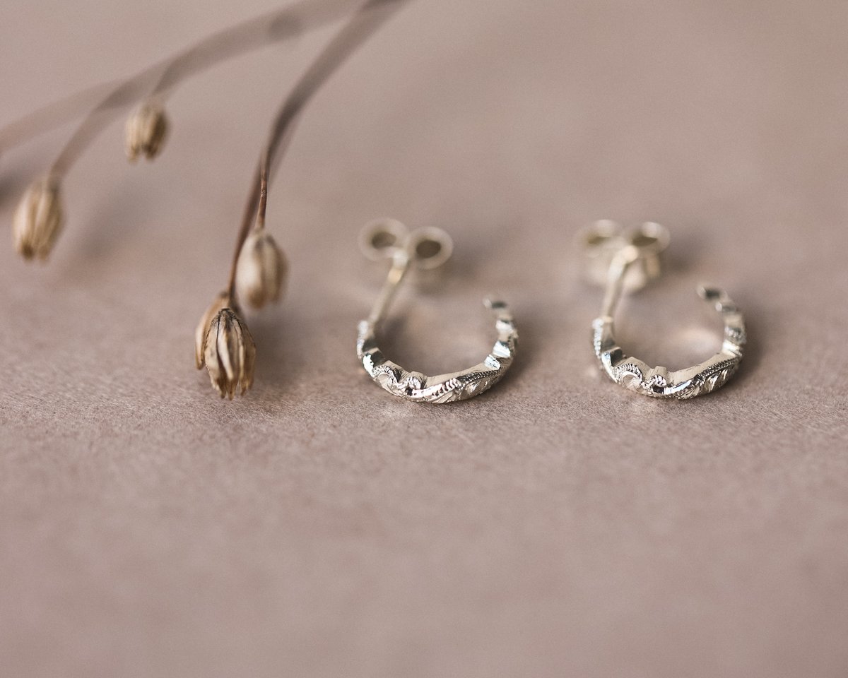 Little Floral Carved semi-hooped earrings with stud backs, hand carved by our skilled engraver here in London.