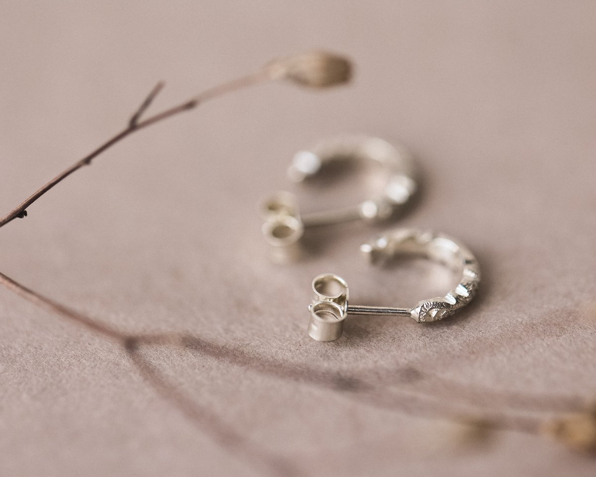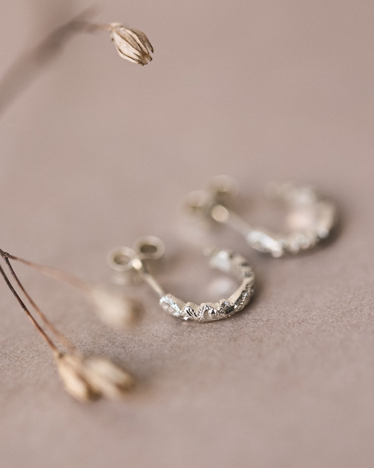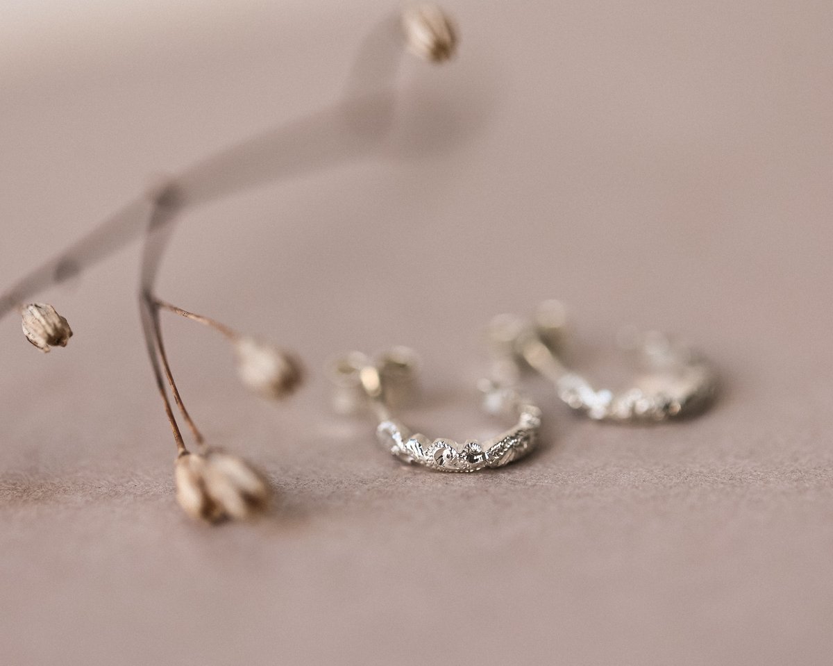 Little Floral Carved semi-hooped earrings with stud backs, hand carved by our skilled engraver here in London.