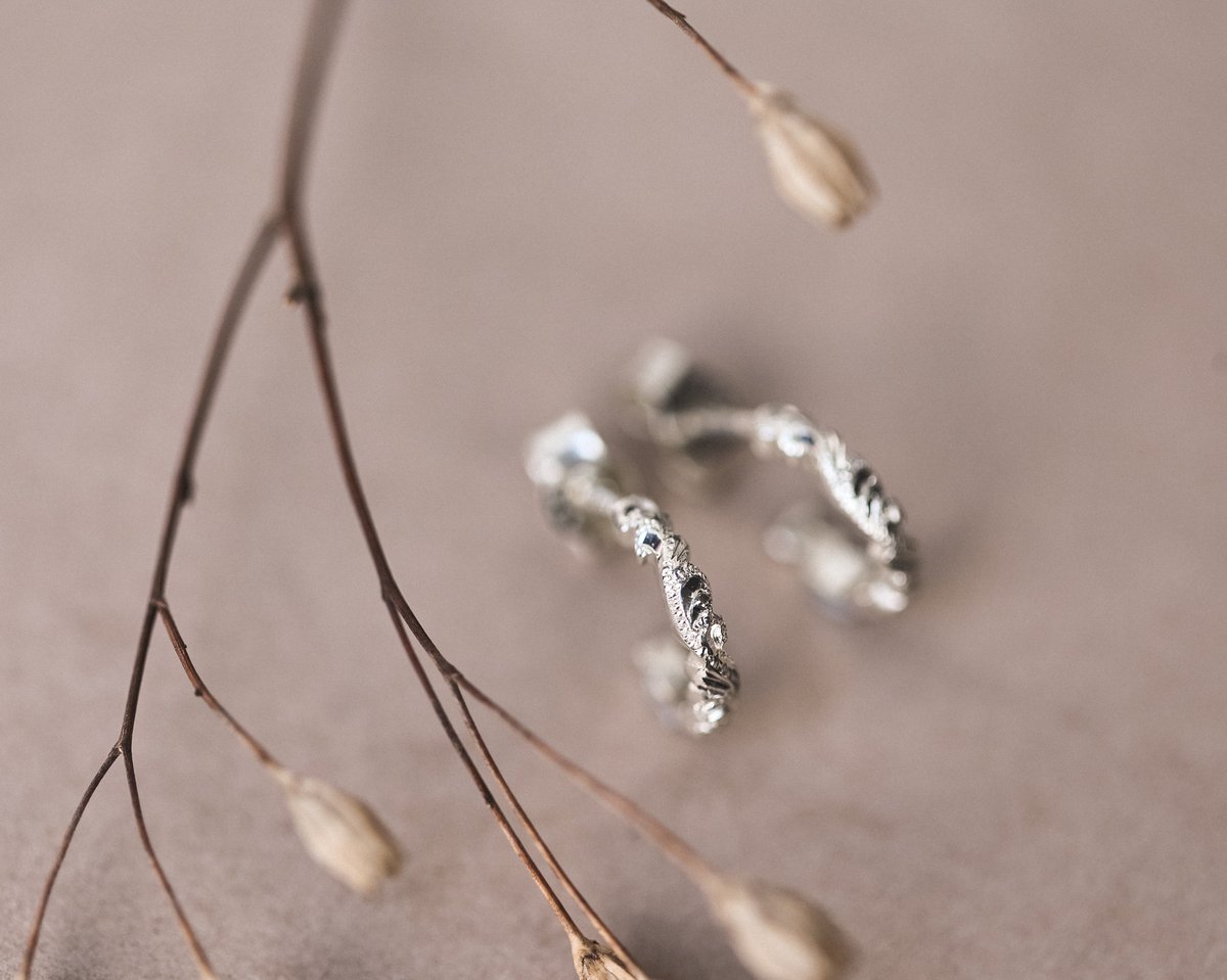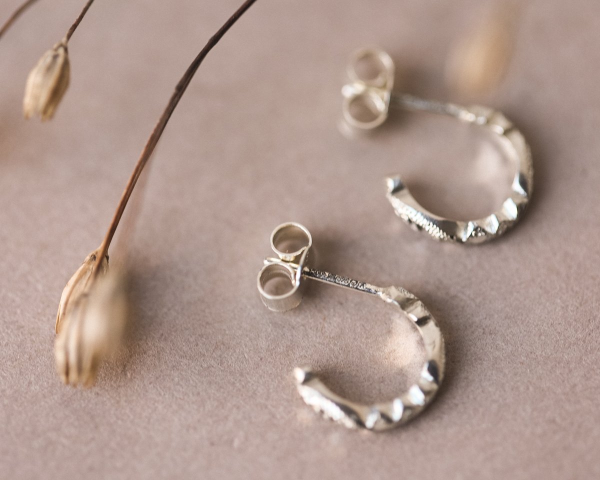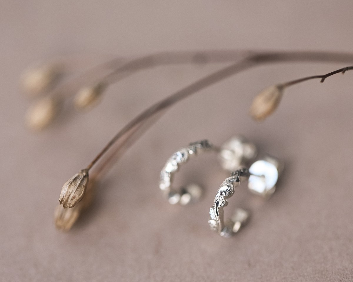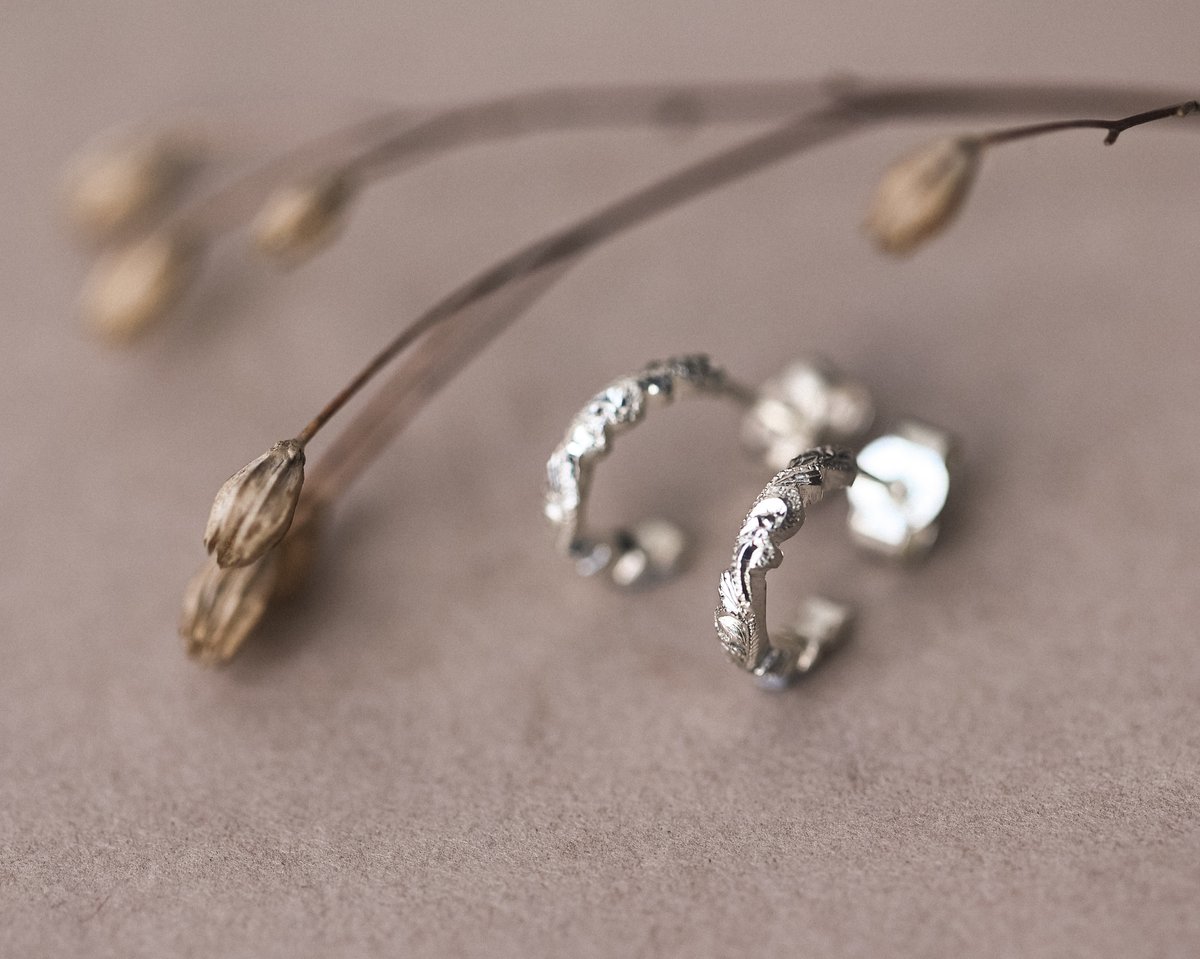 Little Floral Carved semi-hooped earrings with stud backs, hand carved by our skilled engraver here in London.
