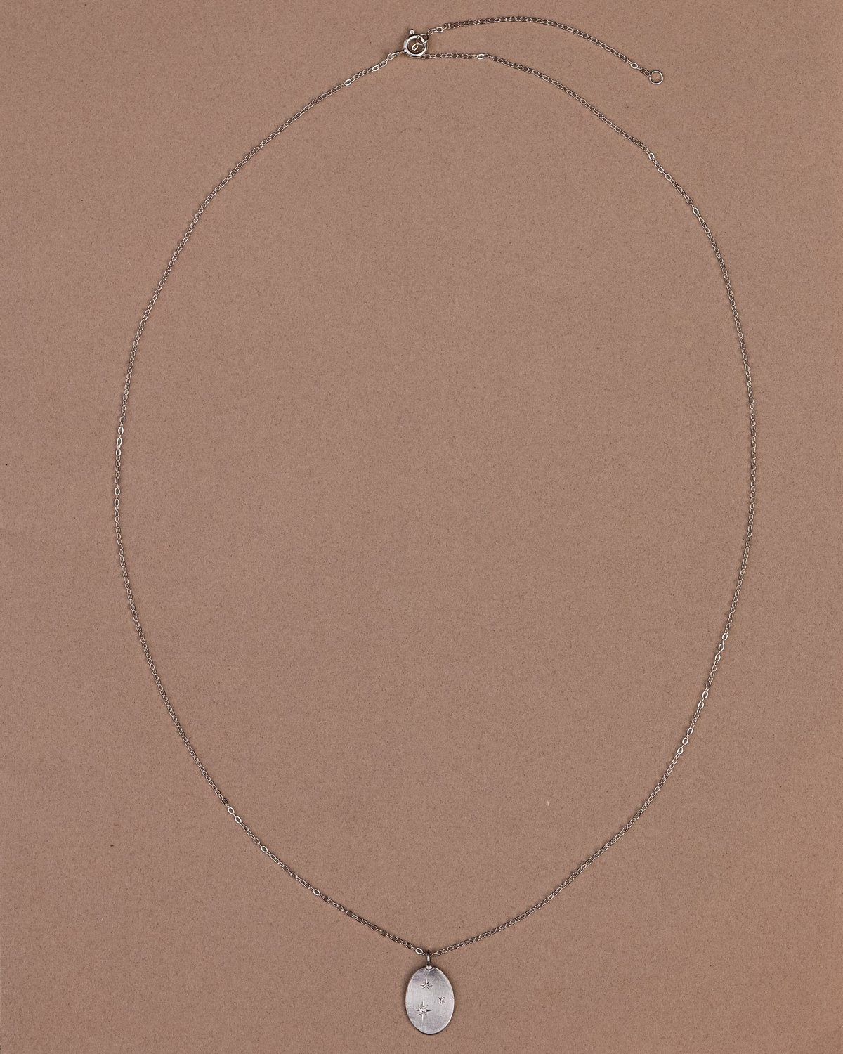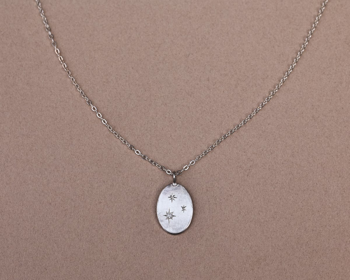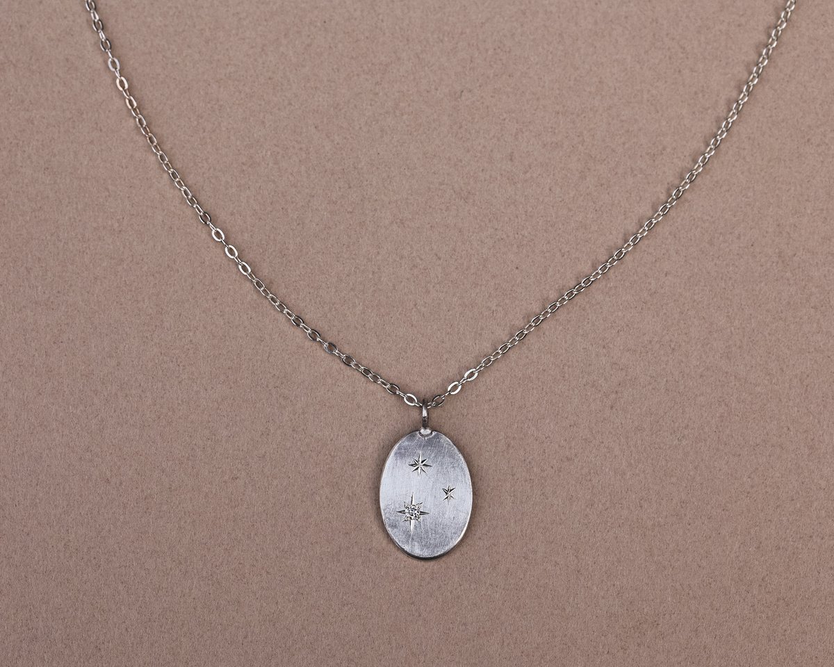 A matte finished silver oval pendant, set with a white brilliant-cut diamond in a star setting, suspended on a fine hammered trace chain.