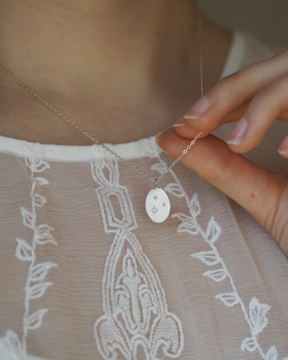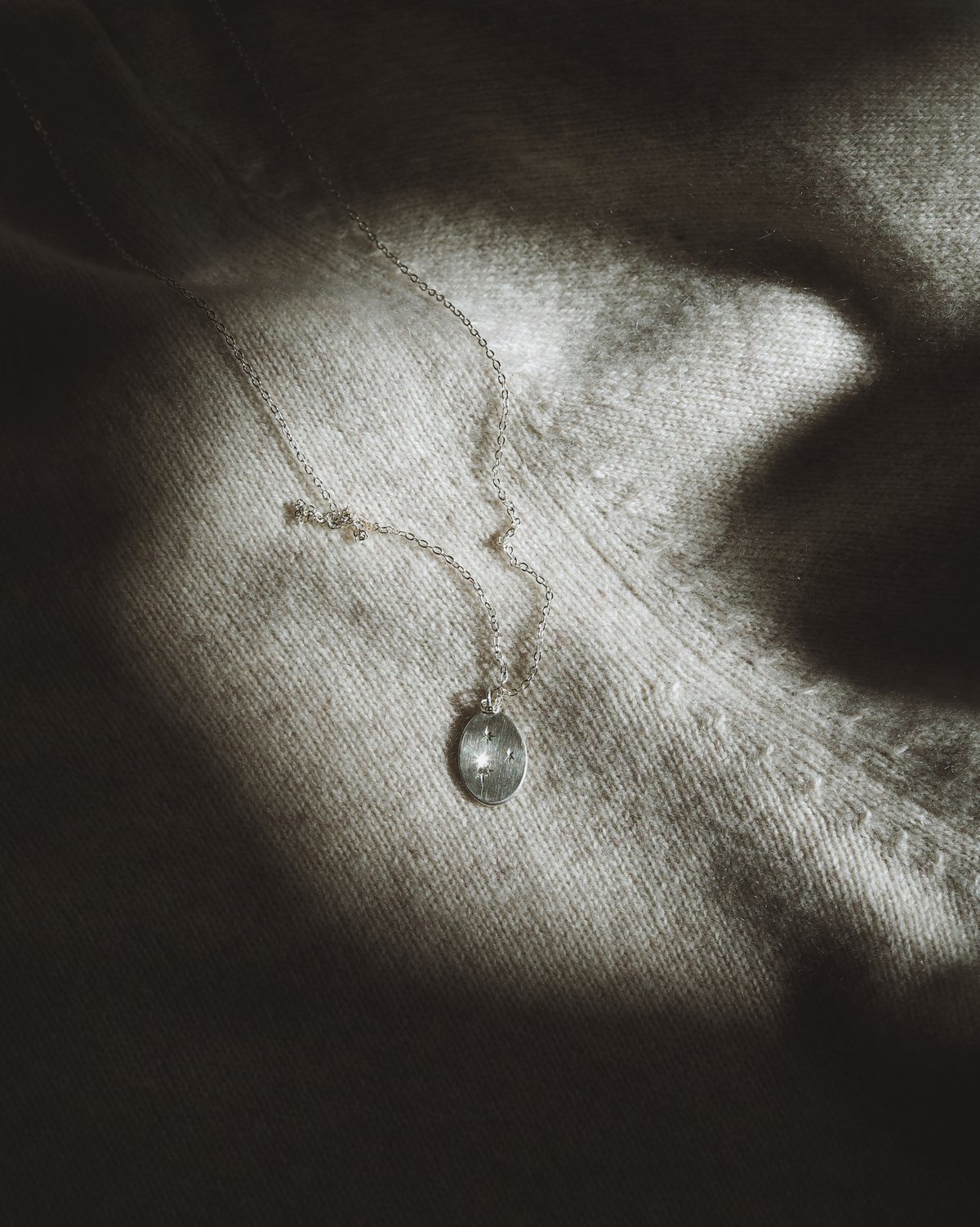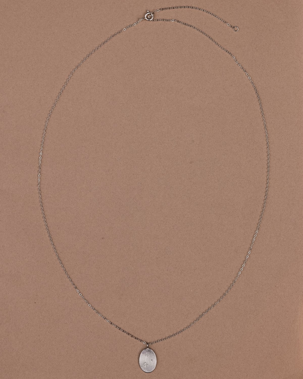 A matte finished silver oval pendant, set with a white brilliant-cut diamond in a star setting, suspended on a fine hammered trace chain.